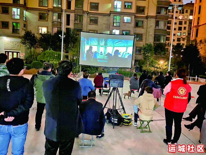 29日傍晚,小区居民陆续来到播放电影现场,物业人员有的搬凳子,有的调试投影仪,还有的在维持秩序。7点整,电影开始播放。