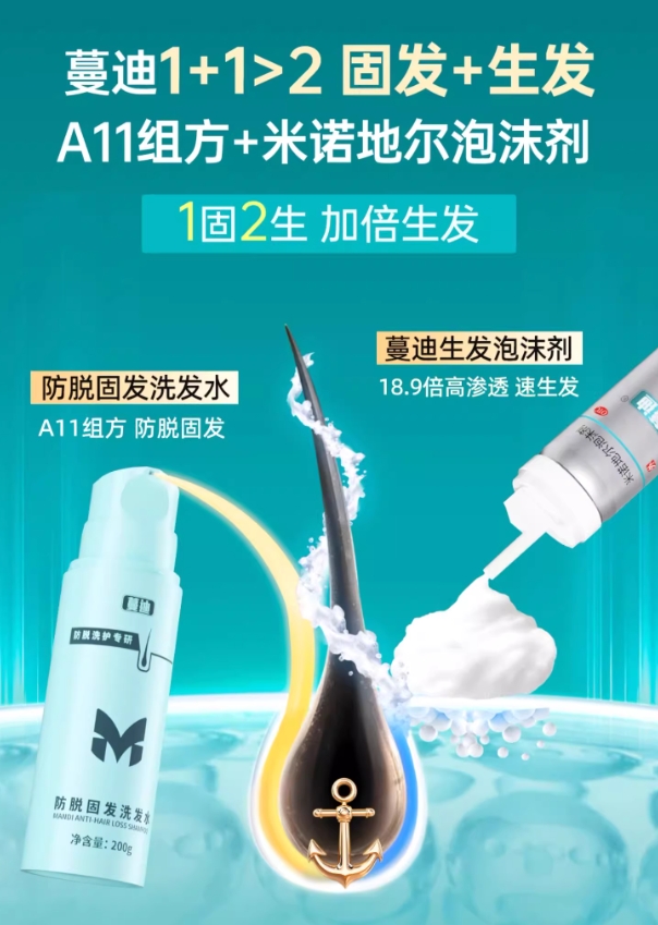 除了米诺地尔泡沫剂,蔓迪还推出了配套的乌诺地尔防脱洗发水。乌诺地尔作为米诺地尔同源衍生物,能抑制毛囊纤维化,延缓脱发进程。洗发水中更复配侧柏叶、何首乌、菟丝子等11味中药成分,以及烟酰胺、神经酰胺等修护成分,共同起到清洁、滋养、强韧发根的作用,形成了一套完整的头皮健康管理方案。